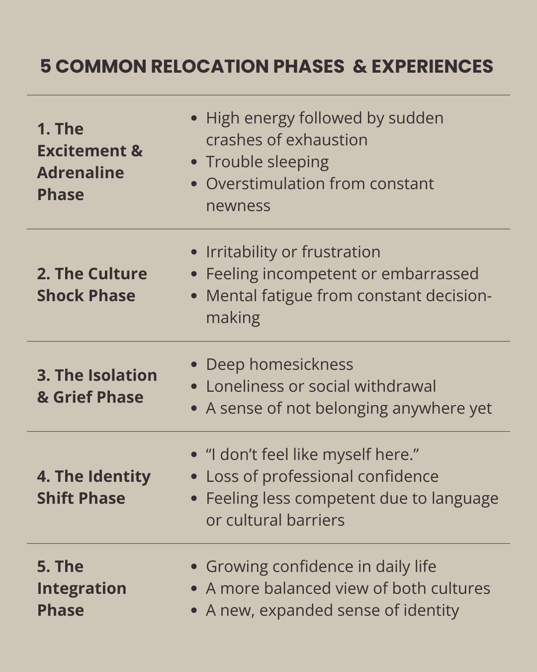 Although the above phases are common, where someone gets stuck and how their body responds to relocation trauma, is an individual process.