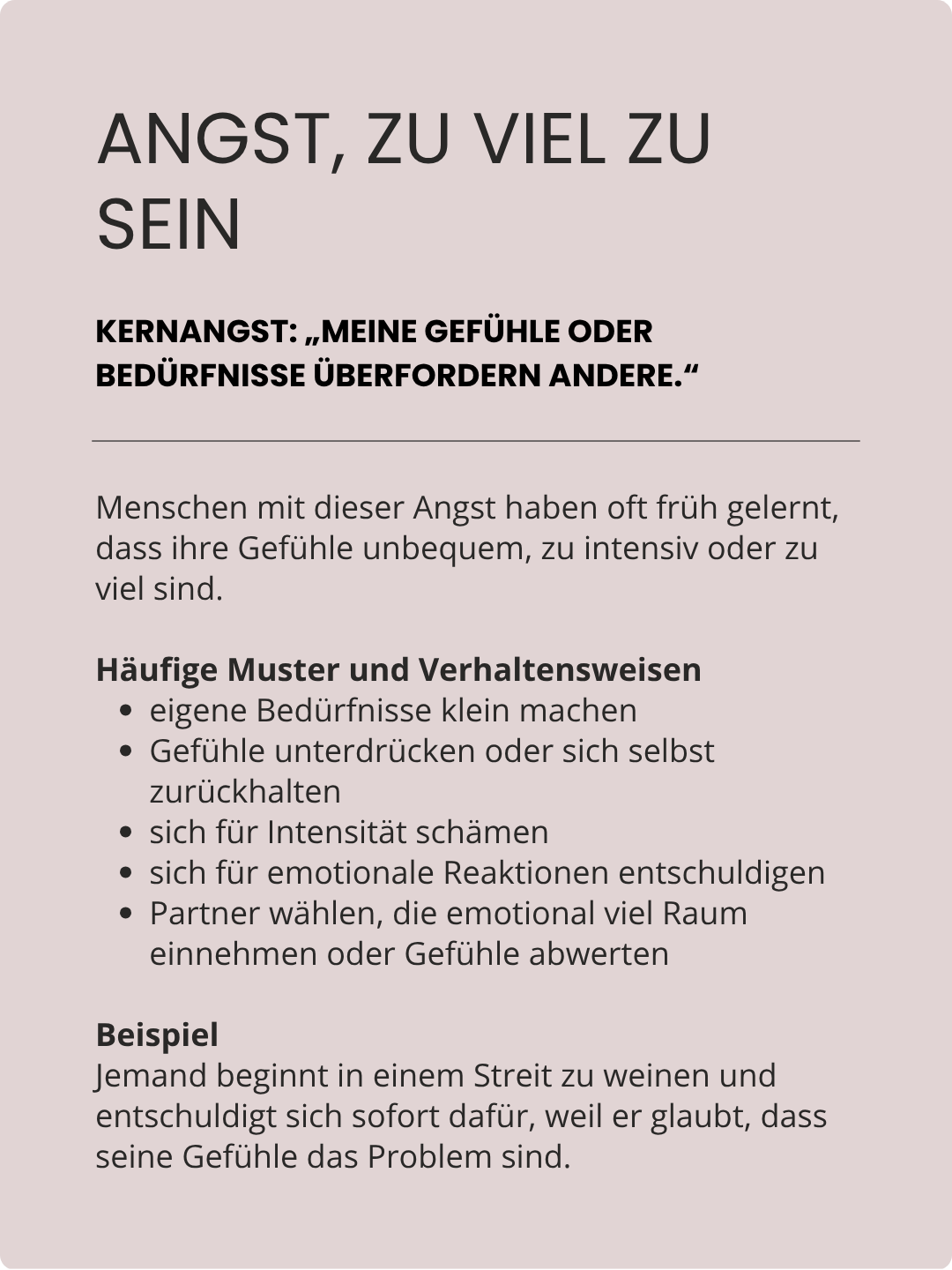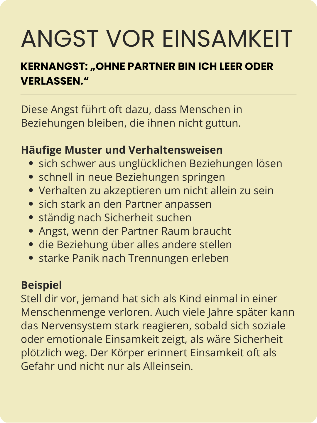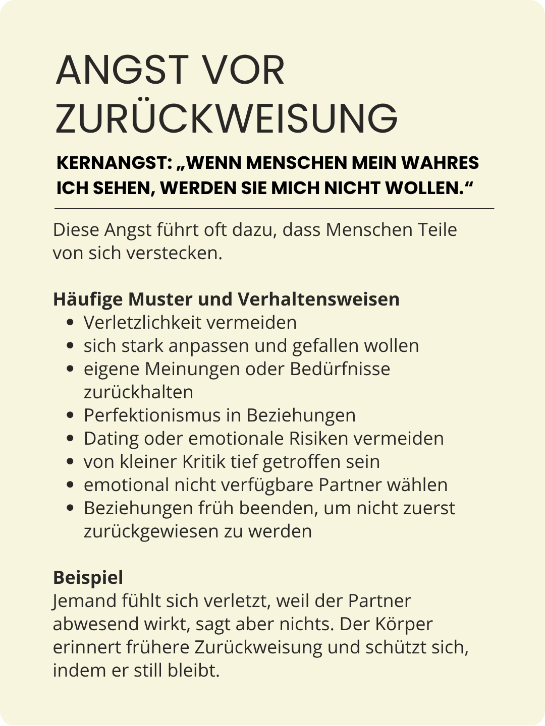 Die meisten Menschen erkennen sich in zwei oder drei dieser Ängste wieder. Manche Ängste führen auch zu sehr ähnlichem Verhalten und sehen von außen fast gleich aus.