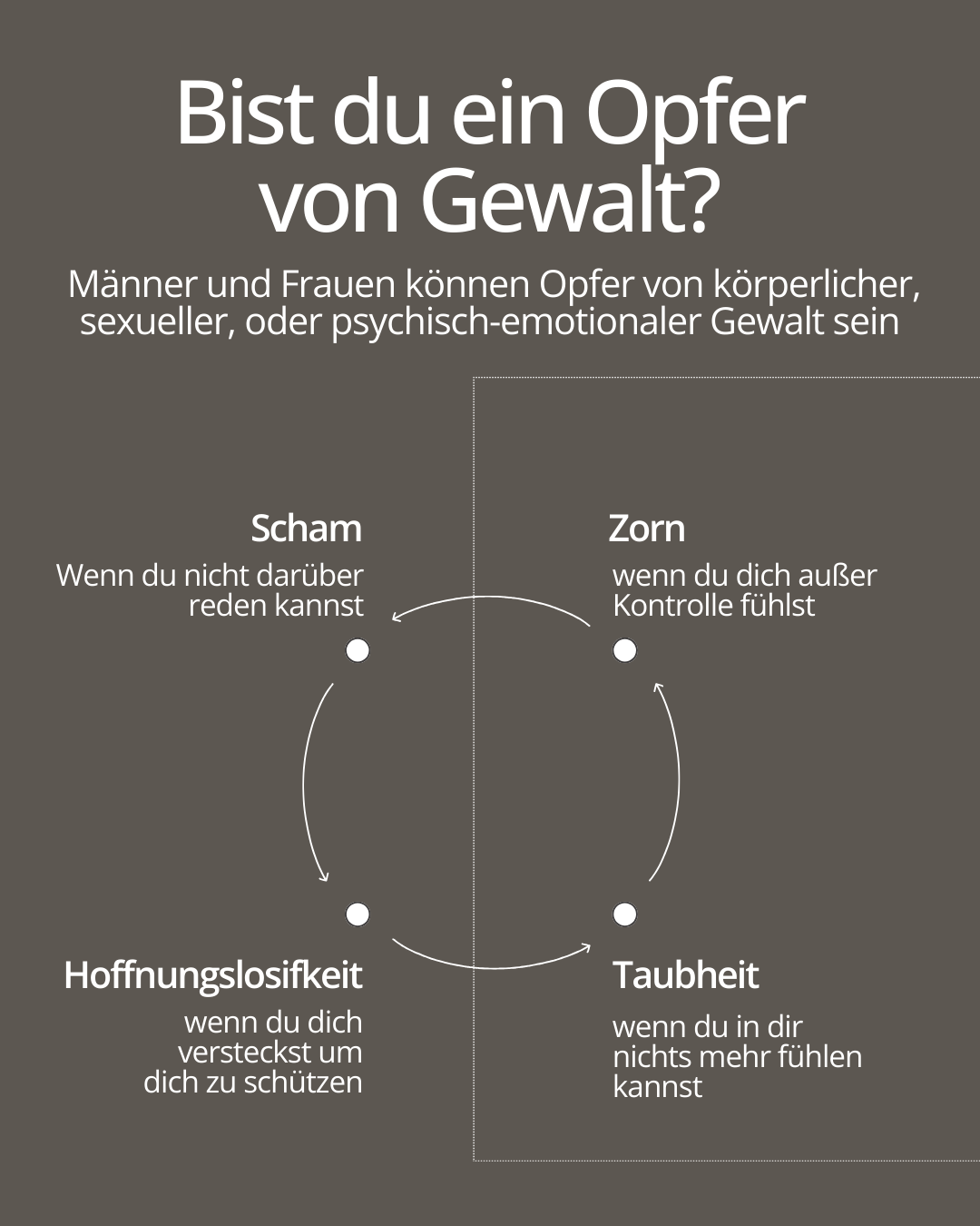 Die neuste Datenerhebung des Bundeskriminalamt zeigt: Gewalt und Missbrauch werden meist nicht angezeigt. Wenn du in einer akuten Gefährdungssituation bist sind hier einige Nummern an die du dich rund um die Uhr wenden kannst. Sobald du Kapazität hast um das Thema anzugehen, und sei es für nur eine Stunde, kannst du eine Sitzung buchen .